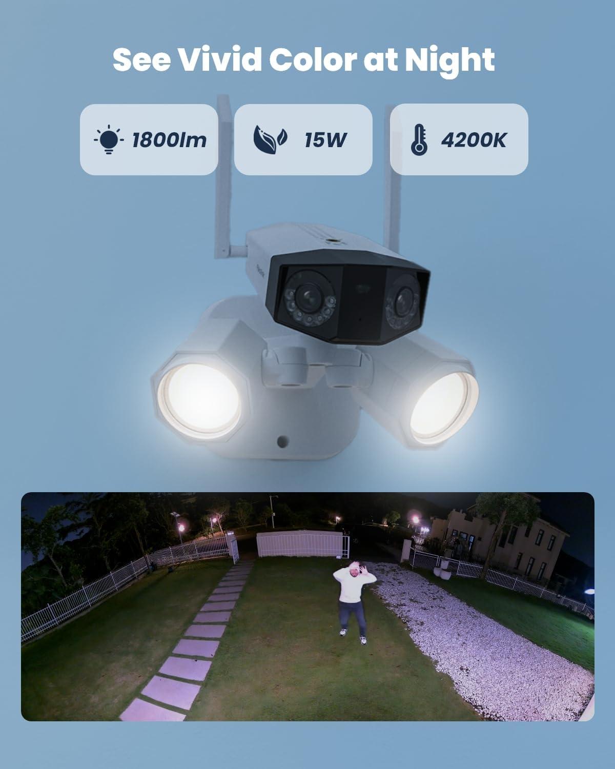 1800LM FLOODLIGHT CAMERA:The 15W 4200K floodlight integrated offers an impressive 1800 high lumens. It auto-activates in low-light, providing advanced color night vision. Customize lighting to fit your needs, enjoy all-day security and convenience.