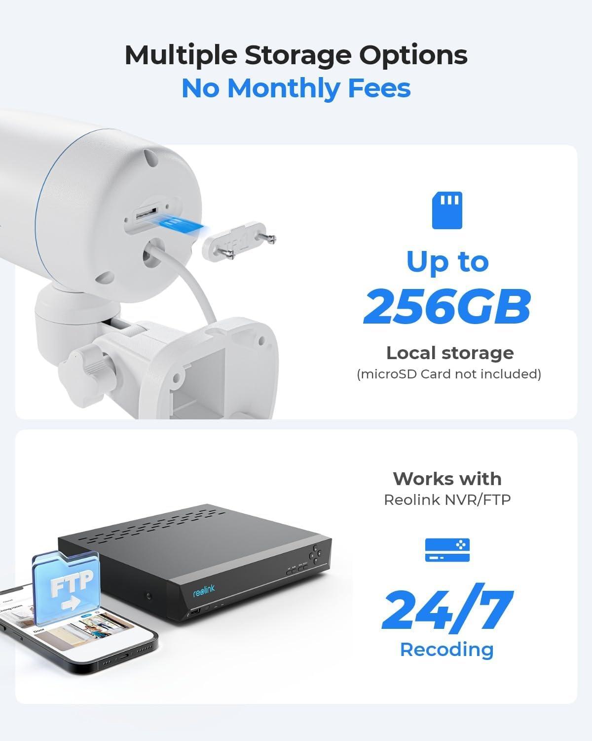 SIMPLIFIED PoE INSTALLATION & MULTIPLE RECORDING OPTIONS : Thanks to the Power-over-Ethernet technology, power, data, and 4K UHD videos can be stably transmitted at the same time via an Ethernet cable. You can save video on a microSD card (up to 512GB, not included), a Reolink NVR, or an FTP server for 24/7 recording. Note: The PoE NVR/switch/injector and DC power adapter are not included.