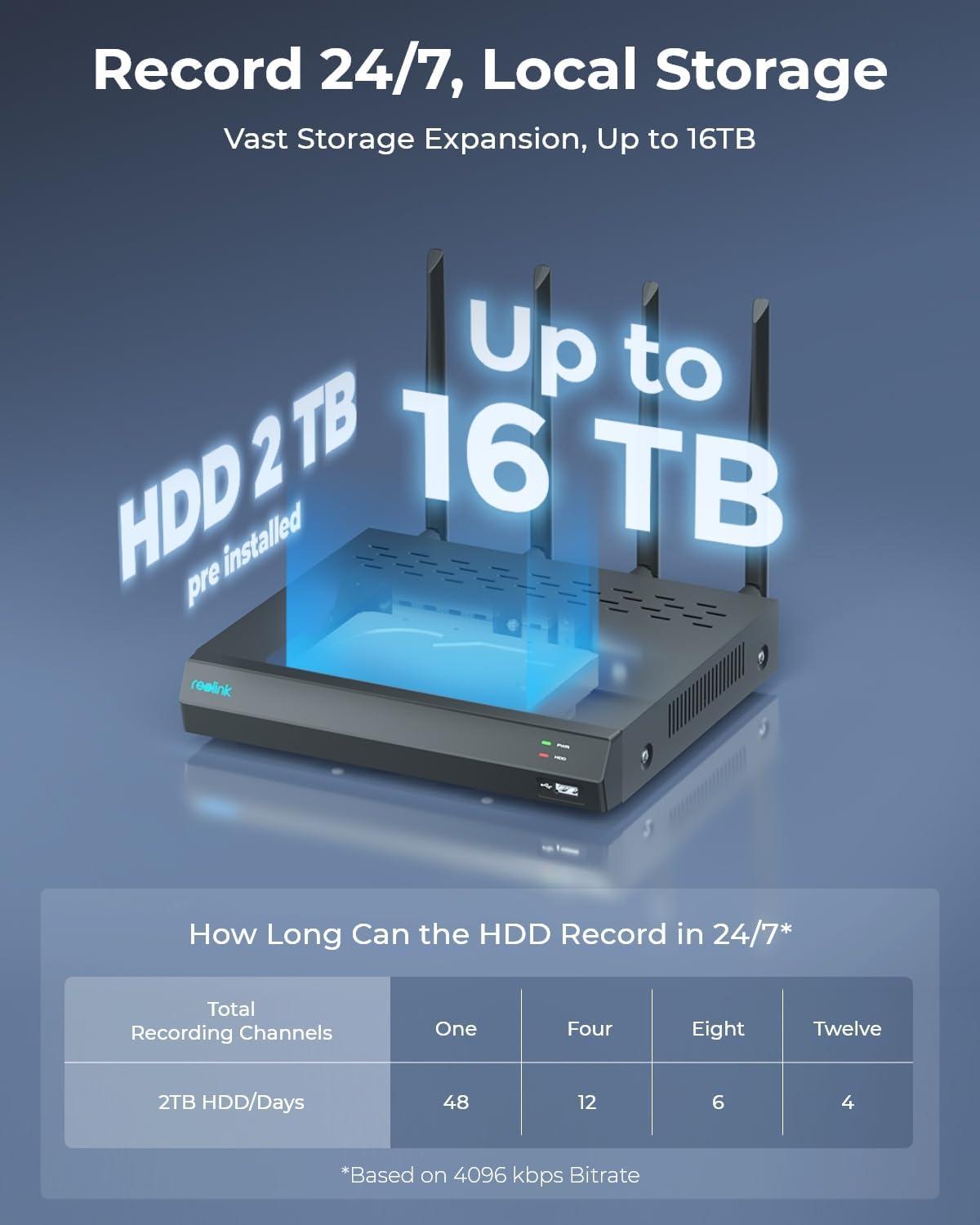 EASY TO DIY YOUR OWN SYSTEM: Accommodating up to 16 Reolink IP cameras (up to 12 plug-in Wi-Fi and PoE cameras) and compatible with all Reolink cameras (except 4G cameras), this wireless NVR system provides great flexibility to craft your customized surveillance system according to your needs. (This Wi-Fi NVR does NOT support power over Ethernet technology, so network and power cables or a Reolink PoE switch is recommended when used with PoE cameras; when used with battery Wi-Fi cameras, the cameras and NVR need to be upgraded to the latest firmware.)
