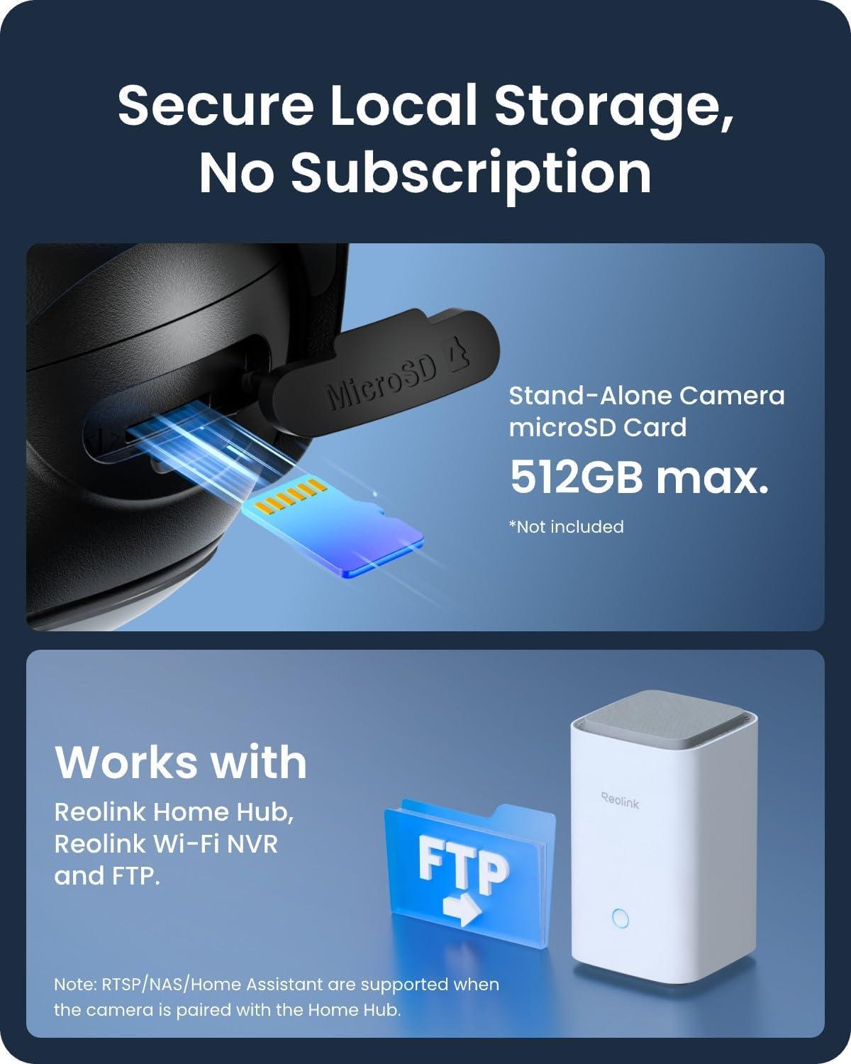 Flexible Storage Options: Save footage locally to a microSD card (up to 512GB), Reolink Home Hub, or FTP server—no subscription fees. Build your own wireless Reolink security camera system with Home Hub.