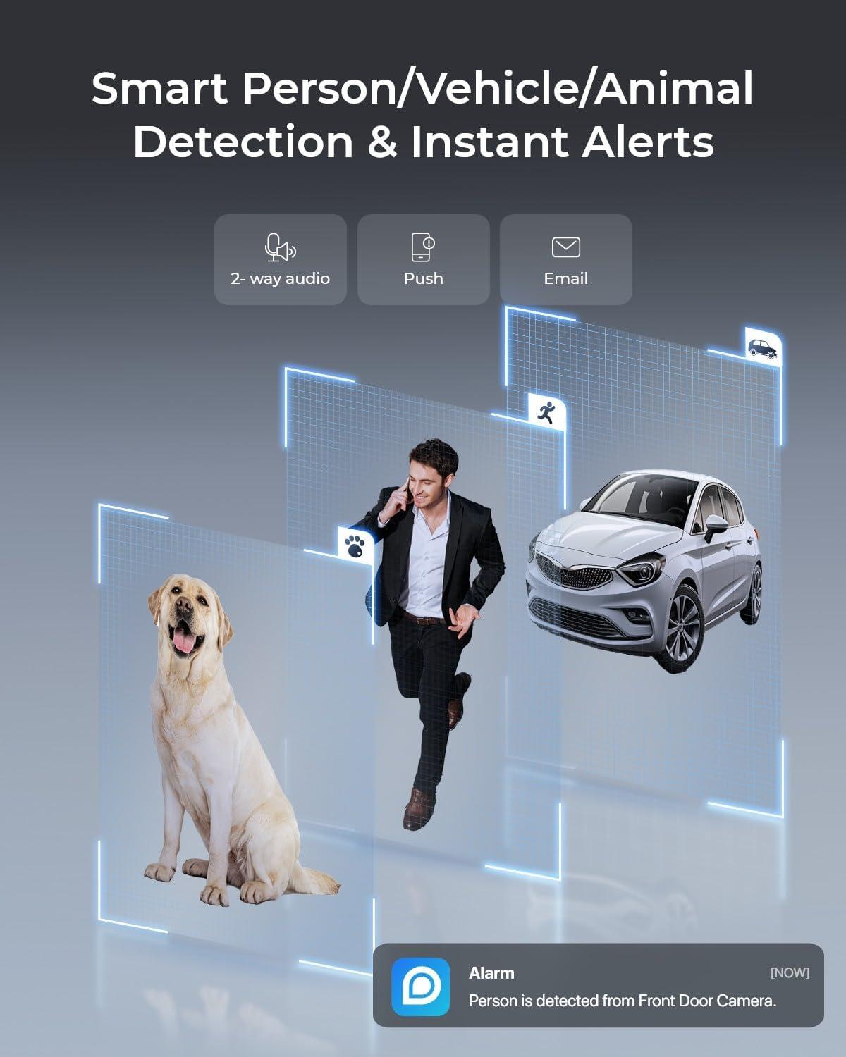 SMART DETECTION & ALERTS: Accurately detect person/vehicle/animal movements, greatly reducing false alarms. Our upgraded animal detection covers a wide range of animals, making your security even more efficient. Upon motion events, instant alerts will be sent your way.