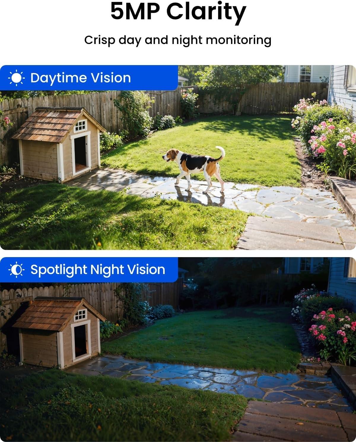 5MP/2K+ HD Resolution Solar Camera: Enjoy crystal-clear footage day and night from these solar security cameras. A built-in spotlight enables color night vision for enhanced monitoring.