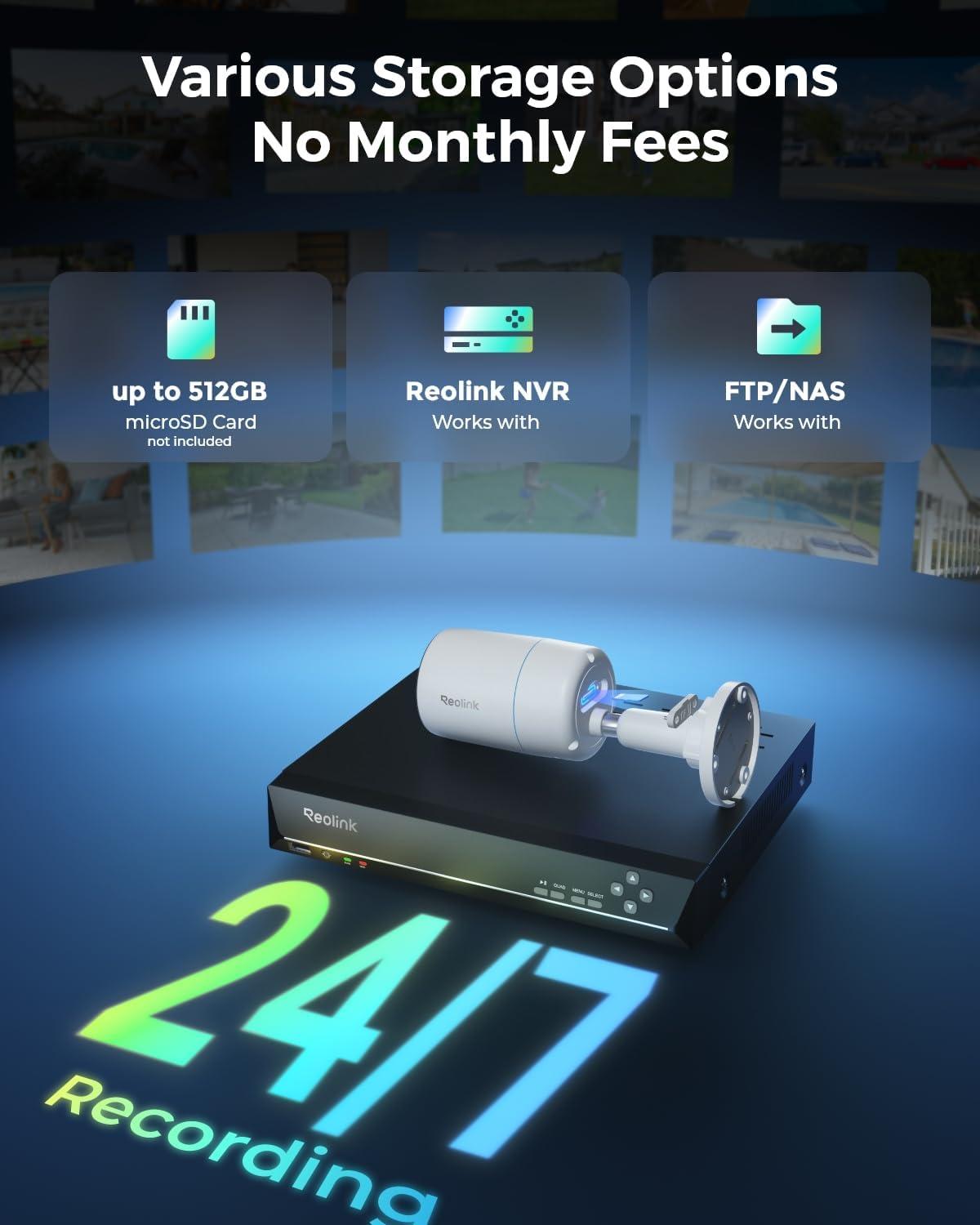 Easy PoE Setup: Enjoy plug and play connection with Power over Ethernet technology. Plug in one cable and you are good to go for reliable data and power transfer. Feel free to record 24/7 with various storage options, such as microSD card up to 512GB, NVR HDD, FTP server. Note: The PoE NVR/switch/injector and DC power adapter are not included.
