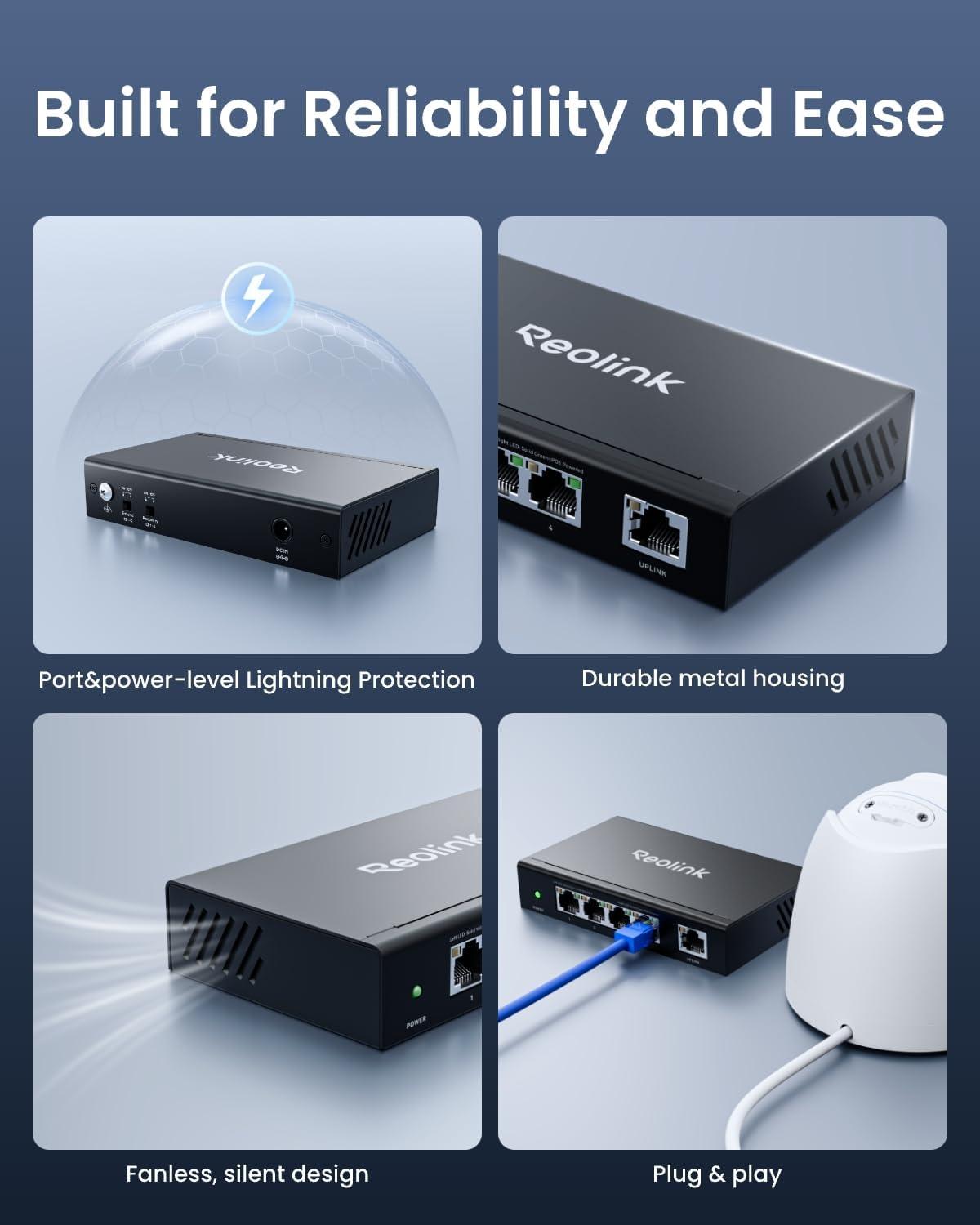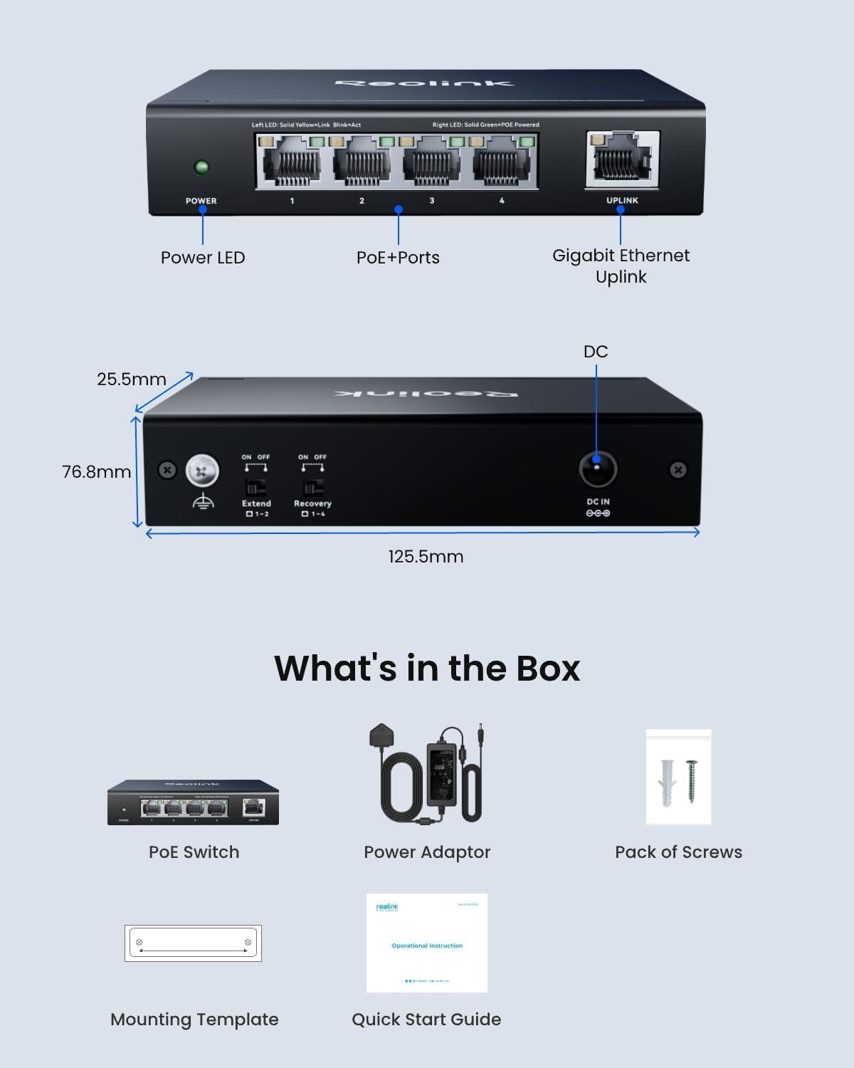 【Advanced Modes】Activate Extend Mode to set ports 1–2 to 10Mbps and extend PoE transmission distance up to 820 ft (250 meters)* — ideal for long cable runs. In Recovery Mode, the switch detects unresponsive PoE devices and reboots them automatically, minimizing manual maintenance. *Note: Extend Mode requires standard Cat5E or higher Ethernet cables.