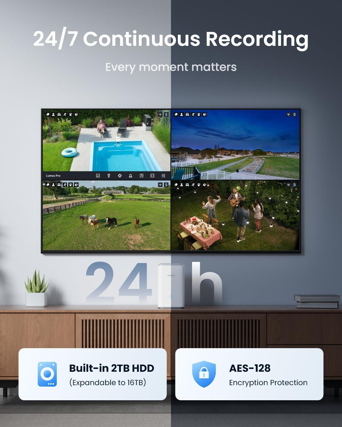 HIGH CAPACITY FOR STORAGE: Equipped with a 2TB HDD, expandable up to 16TB, the Home Hub Pro allows for 24/7 recording with no monthly fees. Benefit from national AES-128 encryption, encrypted recordings can only be accessed with the correct code, so even if your camera is stolen, your footage remains protected.