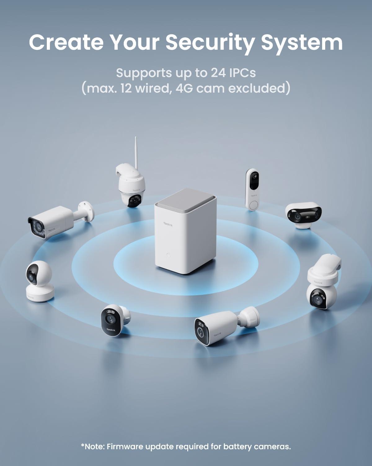 ALL-IN-ONE MANAGEMENT PLATFORM: The Home Hub Pro serves as the center for storage, alarm and management. It supports up to 24 cameras (max. 12 wired ones) and is compatible with all battery, wired, PoE cameras, and doorbells (excluding 4G products), making it easy to build a comprehensive security system.