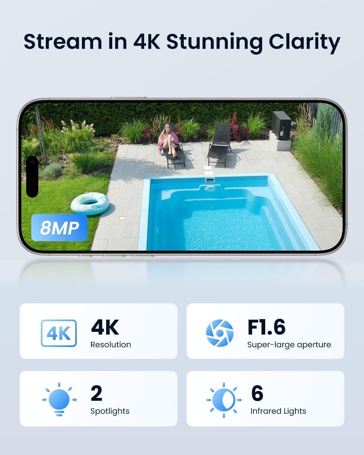 4K ULTRA HD COLOR NIGHT VISION: With the F1.6 super-large aperture, this 8MP camera doubles the light intake compared to F2.0 apertures. It captures vivid color images even in low-light conditions, while six high-power infrared lights provide sharp and detailed black-and-white night vision.