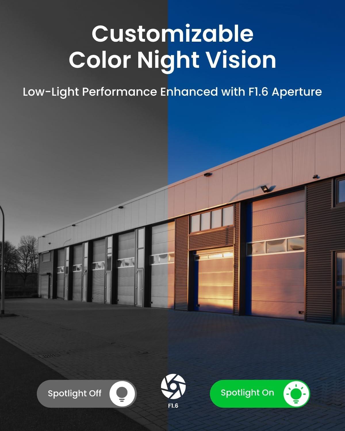 CUSTOMIZABLE COLOR NIGHT VISION: By switching on/off the smart mode for color night vision, you can set the spotlights to activate either on detection or to remain always on. The F1.6 aperture delivers clearer, brighter nighttime footage in low-light conditions.