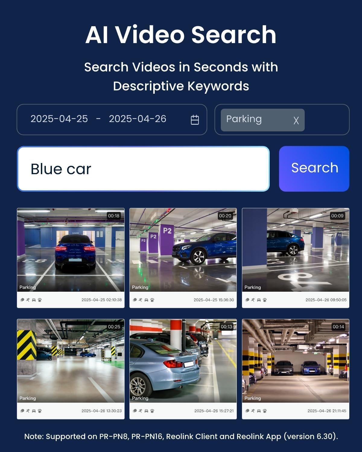 AI VIDEO SEARCH: Get search results in just seconds. By entering descriptive keywords, instantly locates relevant footage based on the features of an intruder, such as the age group and clothing color. Save time with more efficient, precise video search.