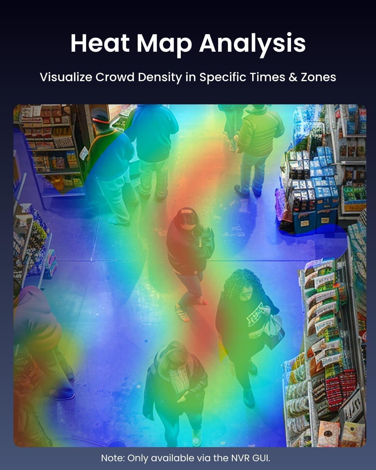 Heat Map Analysis (NVR GUI Only): Gain insights on the crowd density in specific times and zones with the color-coded heat map. By visualizing the customer flow and both the hot spots and dead zones, it helps optimize the overall store layout, ideal for business and retail environments.