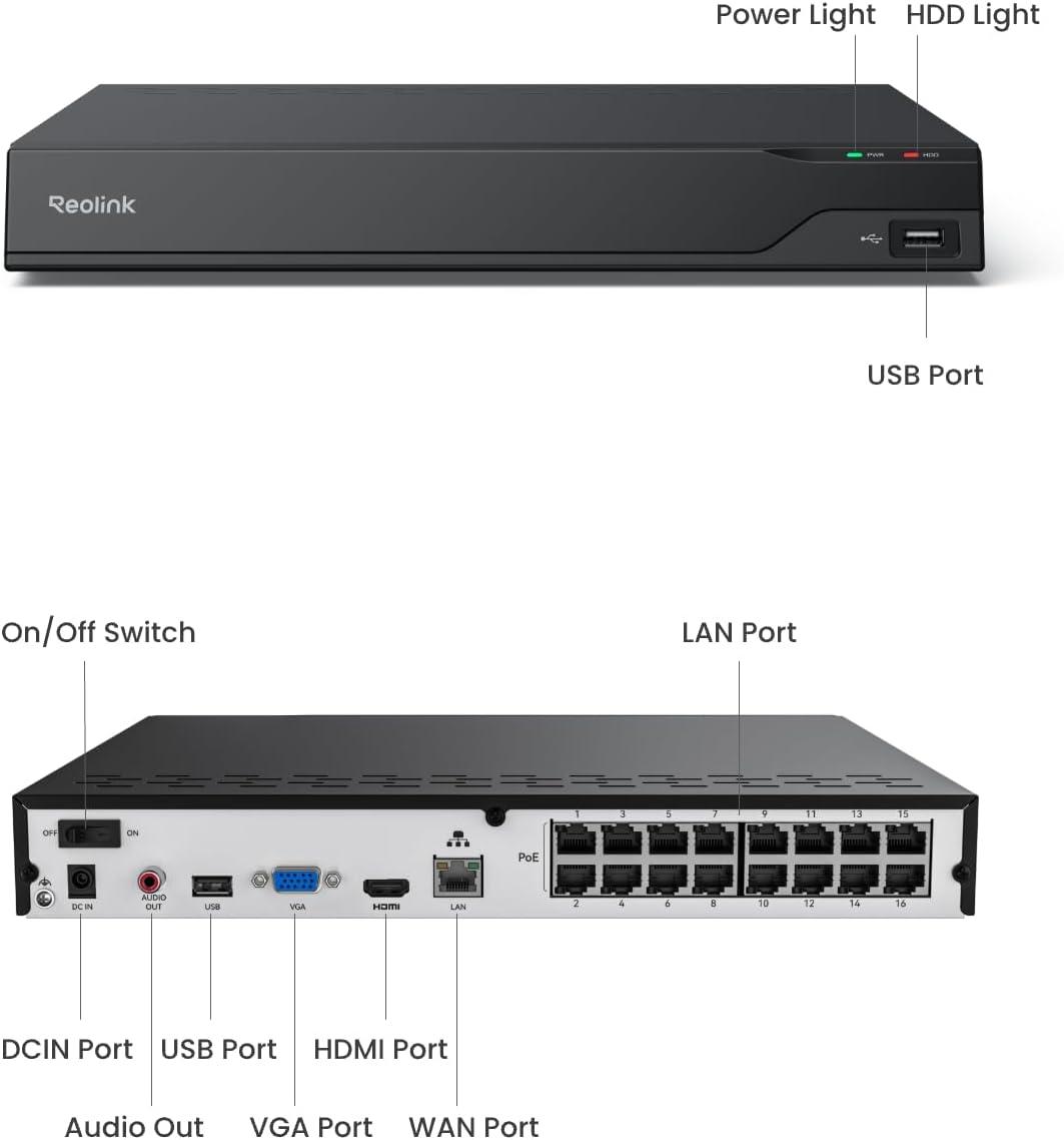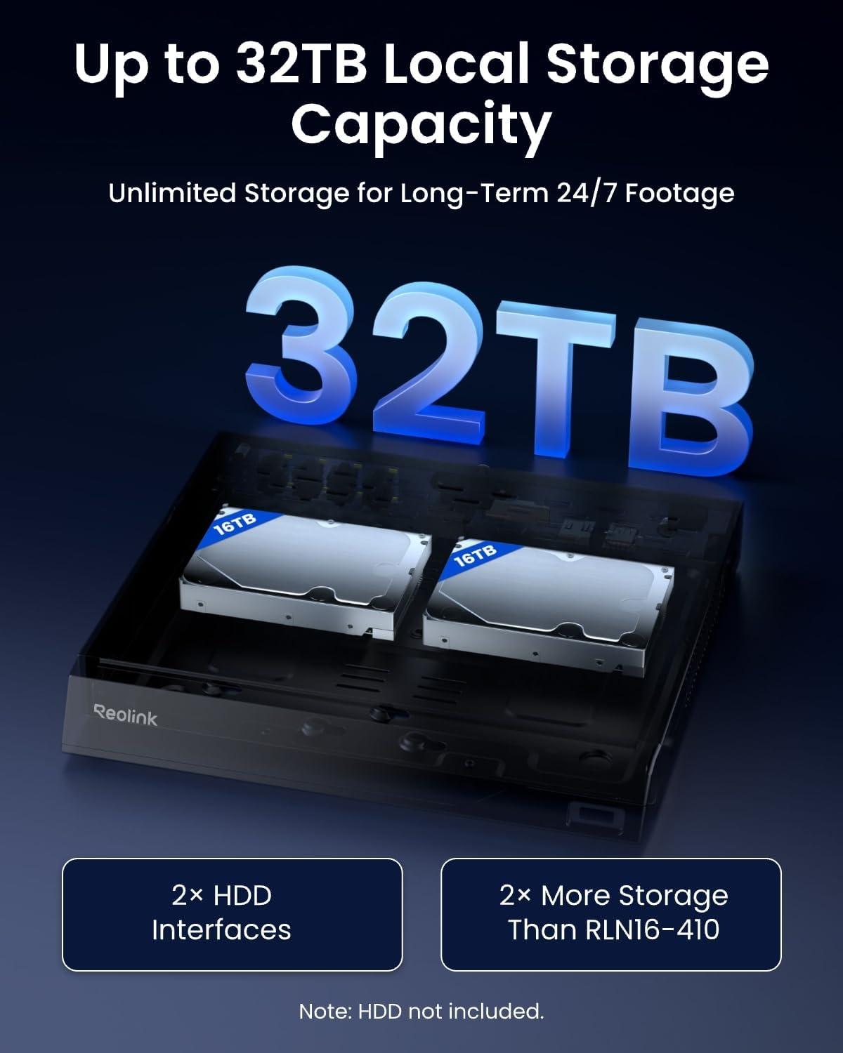 Up to 16MP Resolution & Up to 32TB Local Storage Capacity: Supporting two interal hard drives (not included), this NVR allows extensive footage storage of up to 32TB, twice the capacity of the RLN16-410. Whether for long-term monitoring or large-scale setups, it keeps your footage safe without running out of space.