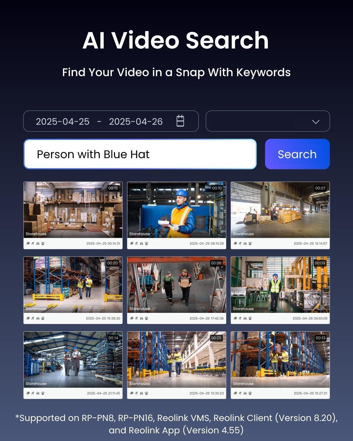 AI Video Search on NVR GUI: Find your needed clips in seconds with AI Video Search. By typing in terms like “white van” or “person with hat”, you can instantly get the result from all event recordings saved in local storage. No more need to scroll through endless footage. Note: This feature requires compatible cameras to work on RP-PN16.